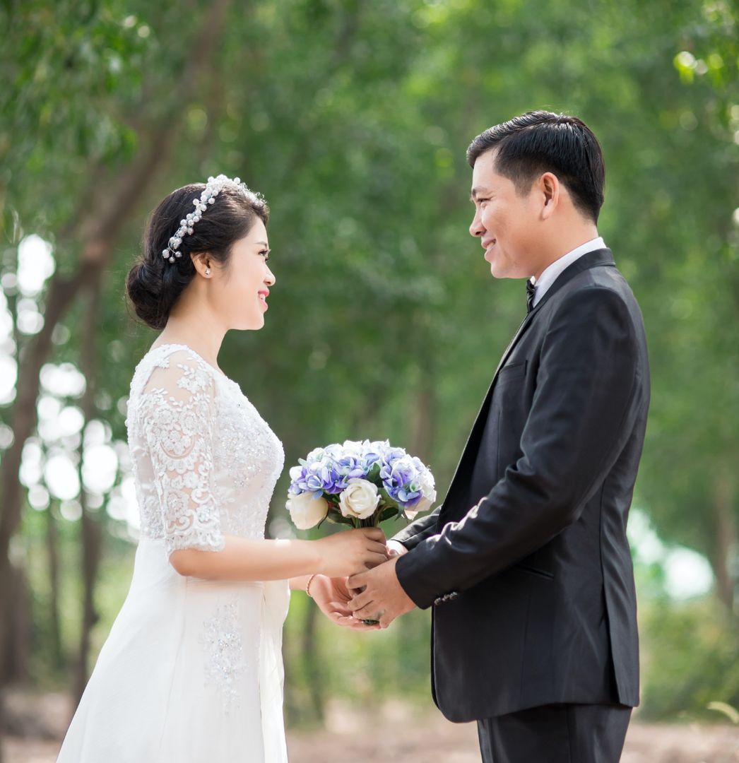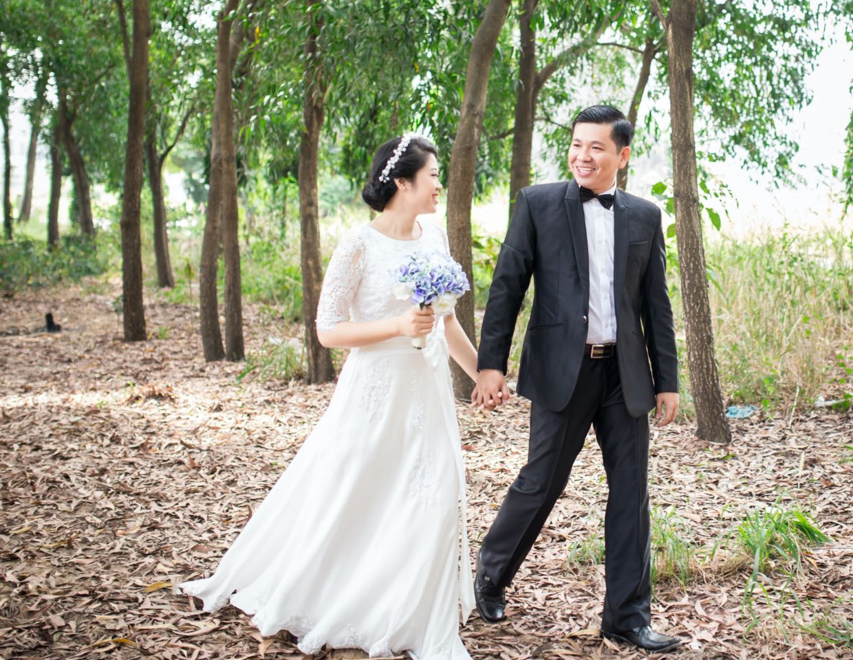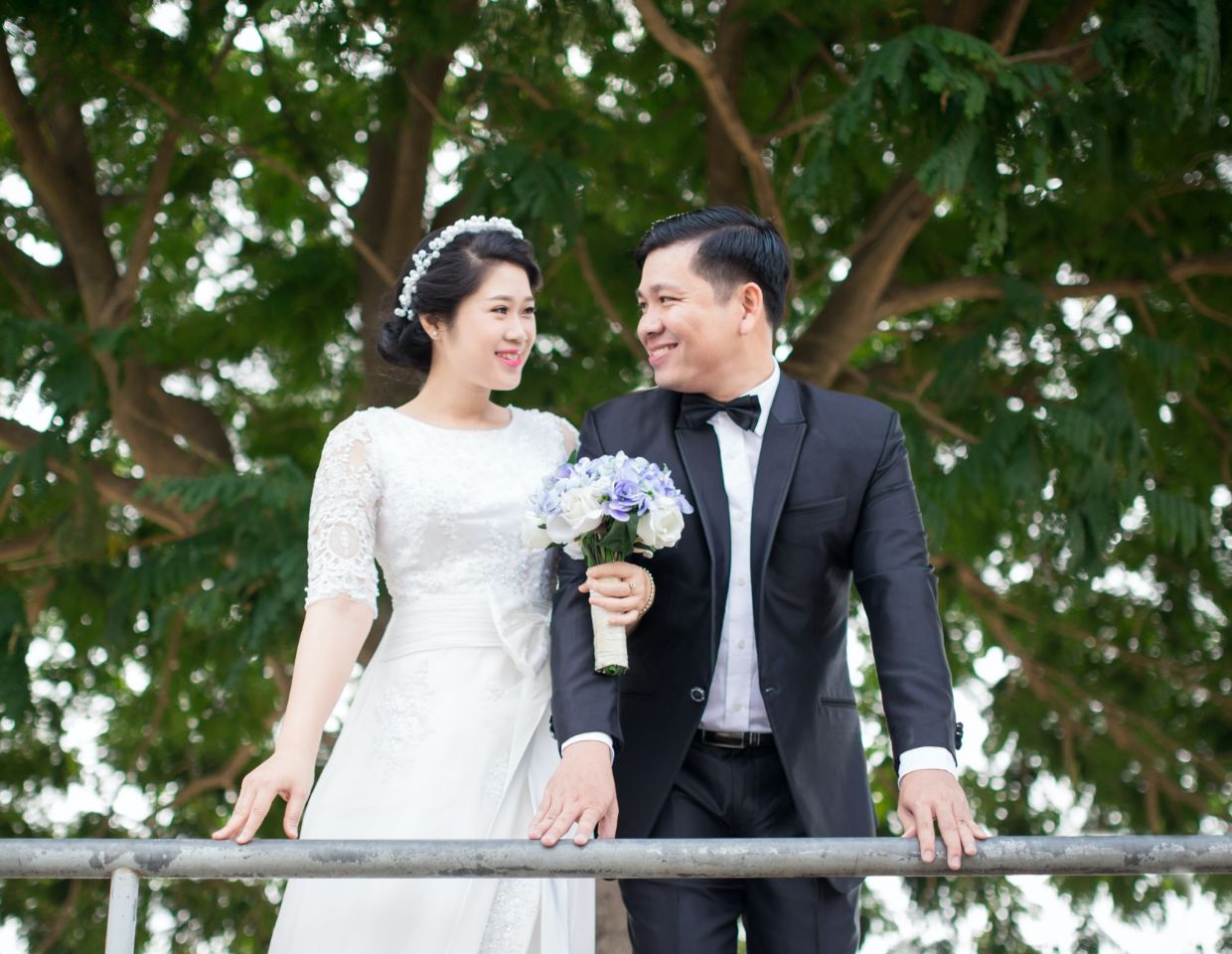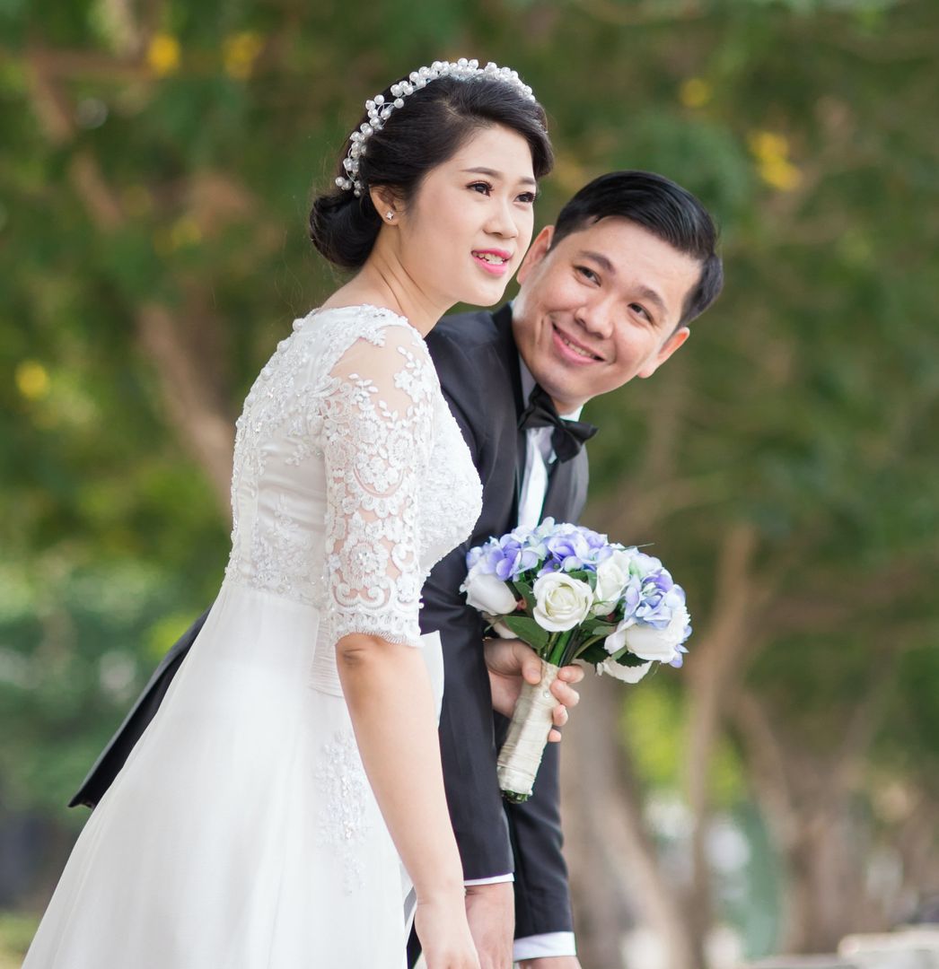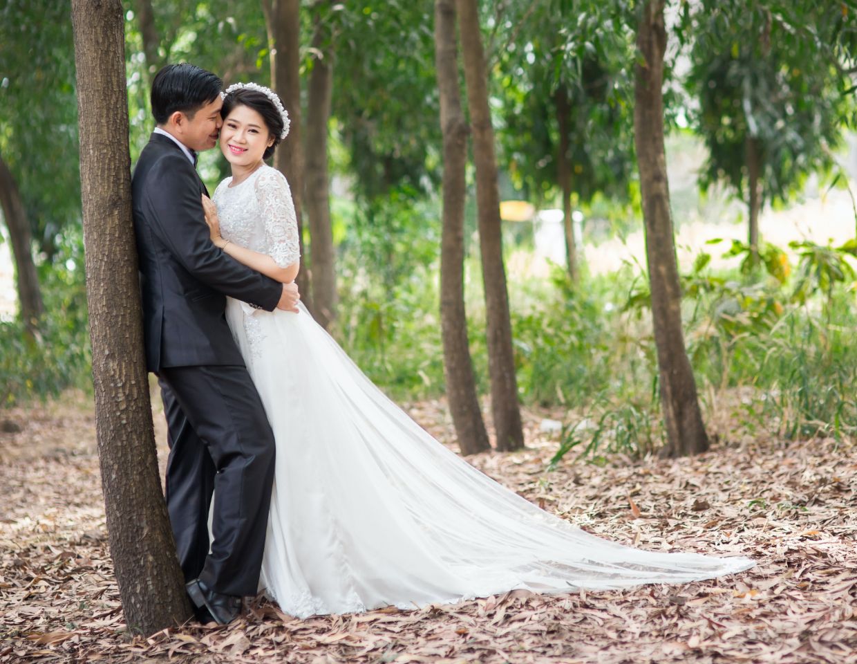In this wedding photo session, the beauty of mother nature is the best background for such an amazing couple. Take a look at how harmonic looks in the white wedding dress on these green trees’ background.